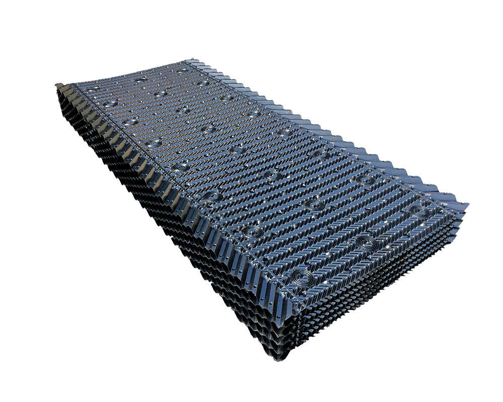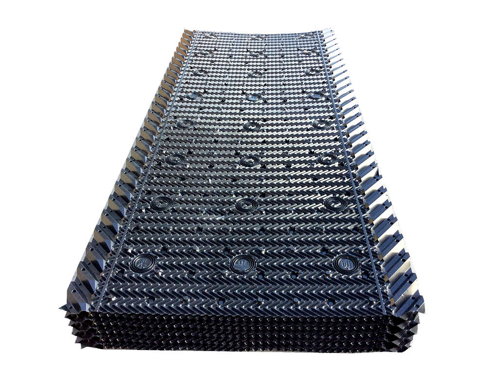 冷卻塔塔芯填料是由優(yōu)質(zhì)PVC聚乙烯片正負壓及吸塑而成,主要采用了水紋波形、梯形波、點波形、S波型、人字波形填料,散熱面積增長系數(shù)大,水流在板面上分布性能好,水和空氣流經(jīng)板面時擾動大等優(yōu)點。填料不易變形,耐高溫,抗老化,且阻燃性能好,風(fēng)阻系數(shù)小。安裝方便,易清洗,運輸方便該散熱填料采用粘接式及懸掛式,安裝簡便,便于清洗,且成功解決了粘接填料因吸積垢、自重而產(chǎn)生變形,且變形后積垢更加嚴重、難于清洗的問題。填料阻燃性能好,阻燃氧指數(shù)指標為42.7,每立方米組裝體質(zhì)量約為15 kg—30kg/m3,組裝高度為0.5m—3.0m,交錯布置,對于塔壁周邊異形塊可視現(xiàn)場布置情況,按實際尺寸切割、安裝。
