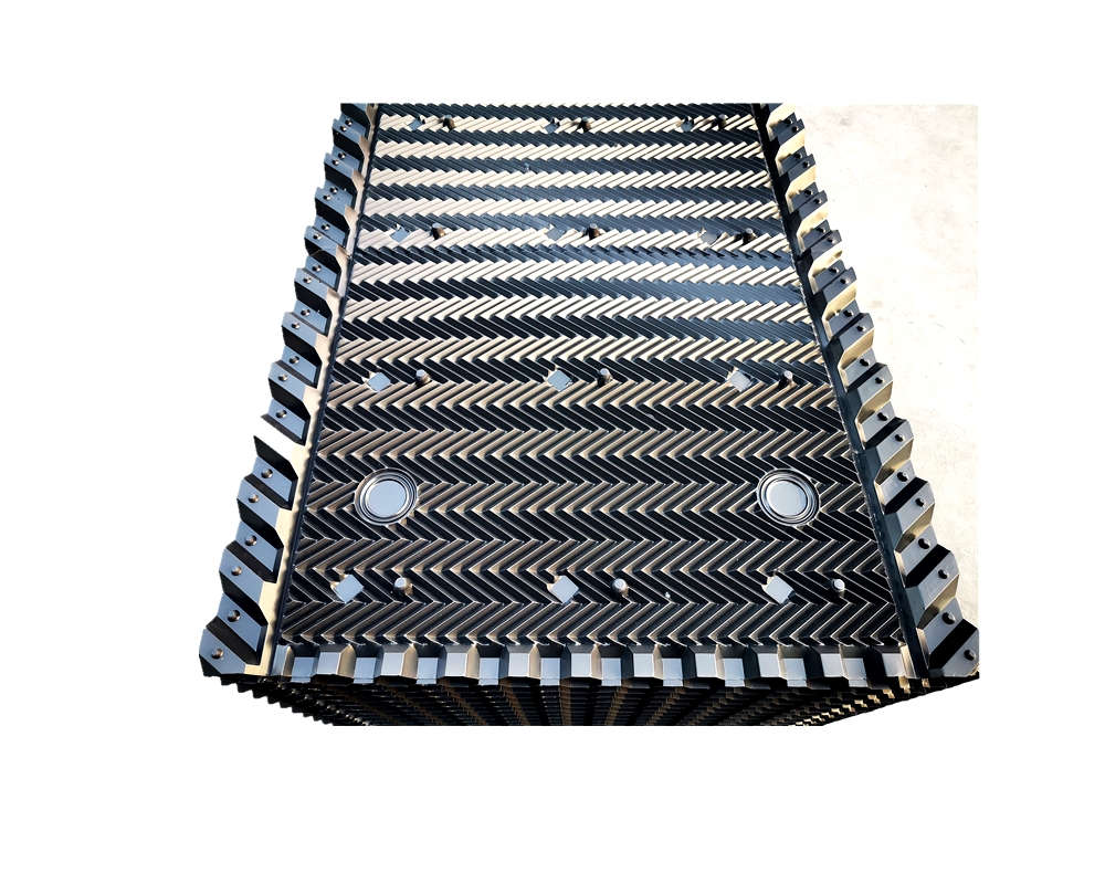 冷卻塔塔芯填料是由優(yōu)質(zhì)PVC聚乙烯片正負壓及吸塑而成,主要采用了水紋波形、梯形波、點波形、S波型、人字波形填料,散熱面積增長系數(shù)大,水流在板面上分布性能好,水和空氣流經(jīng)板面時擾動大等優(yōu)點。填料不易變形,耐高溫,抗老化,且阻燃性能好,風阻系數(shù)小。安裝方便,易清洗,運輸方便該散熱填料采用粘接式及懸掛式,安裝簡便,便于清洗,且成功解決了粘接填料因吸積垢、自重而產(chǎn)生變形,且變形后積垢更加嚴重、難于清洗的問題。填料阻燃性能好,阻燃氧指數(shù)指標為42.7,每立方米組裝體質(zhì)量約為15 kg—30kg/m3,組裝高度為0.5m—3.0m,交錯布置,對于塔壁周邊異形塊可視現(xiàn)場布置情況,按實際尺寸切割、安裝。