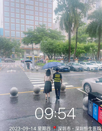下雨天,鐵保宏泰深圳保安公司恒生醫院分隊安保隊員用雨傘接送路人過馬路,讓人稱贊不已。