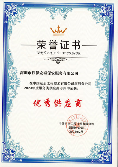 熱烈祝賀我司鐵保宏泰深圳保安服務(wù)公司在中國京冶工程技術(shù)有限公司深圳分公司榮獲2023年度服務(wù)類供應(yīng)商考評(píng)中獲得“優(yōu)秀供應(yīng)商”稱號(hào)。