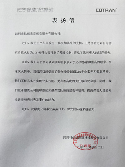 深圳科創新源新材料公司致信表揚我司鐵保宏泰安保隊員